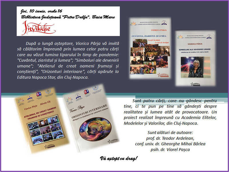 Va avea loc lansarea a patru volume ale jurnalistei Viorica Pârja, care au văzut lumina tiparului în timpul pandemiei: „Cuvântul, ziaristul și lumea”, „Simboluri ale devenirii umane”, „Atelierul de creat oameni frumoși și conștienți”, „Orizonturi interioare”, cărți apărute la Editura Napoca Star din Cluj-Napoca.
