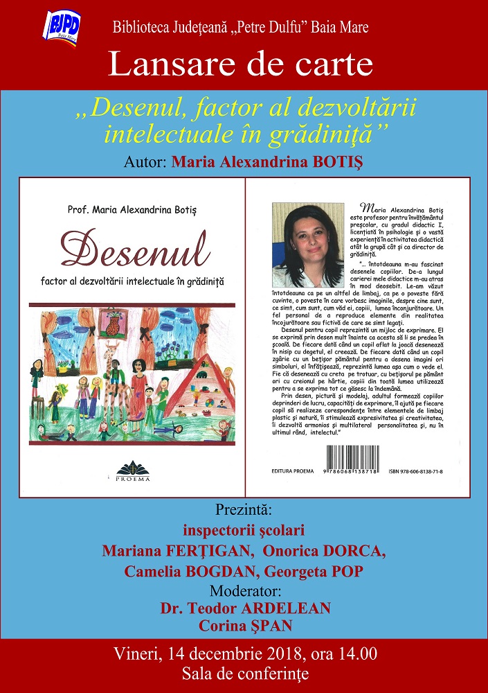 Biblioteca Judeţeană „Petre Dulfu” organizează lansarea cărţii „Desenul-factor al dezvoltării intelectuale în grădiniţă”, autoare: prof. Maria Alexandrina Botiş, volum apărut la editura Proema, Baia Mare, 2018.