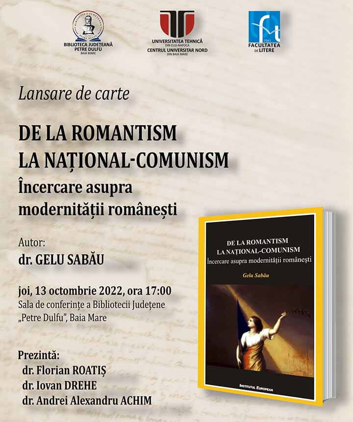 Joi, 13 octombrie, de la ora 17, în Sala de conferințe, Biblioteca Județeană „Petre Dulfu” Baia Mare în colaborare cu Facultatea de Litere din cadrul Universității Tehnice din Cluj-Napoca – Centrul Universitar Nord din Baia Mare organizează lansarea volumului „De la romantism la național-comunism”. Încercare asupra modernității românești”, autor: conf. univ. dr. Gelu Sabău, apărut la Editura Institutul European, Iași, 2021.