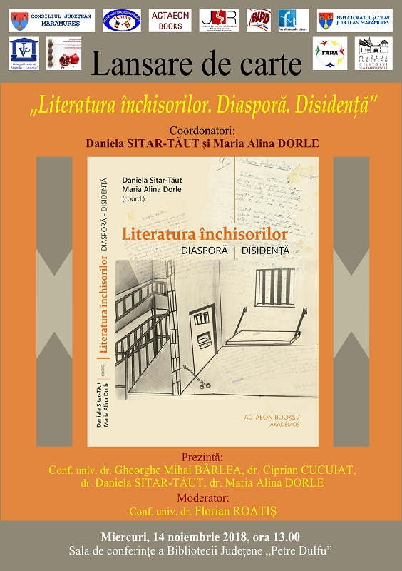 Va avea loc lansarea volumului colectiv „Literatura închisorilor. Diasporă. Disidenţă”, coordonat de prof. dr. Daniela Sitar-Tăut şi prof. dr. Maria Alina Dorle. Volumul, apărut cu sprijinul Consiliului Judeţean Maramureş, la Editura Actaeon Books, Baia Mare, 2018, cuprinde lucrările prezentate în cadrul Colocviilor internaţionale interdisciplinare „Nicolae Steinhardt” – Memorialistica Marii Uniri, ediţia a III-a, eveniment care s-a desfăşurat la Baia Mare, în perioada 8-9 iunie 2018.