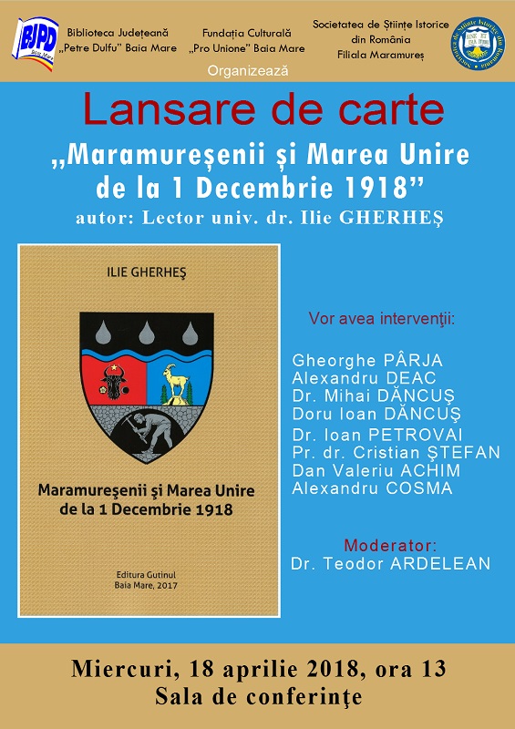 Va avea loc lansarea cărţii „Maramureşenii şi Marea Unire de la 1 Decembrie 1918”, semnată de lect. univ. dr. Ilie GHERHEŞ, apărută la Editura Gutinul, Baia Mare, 2017.