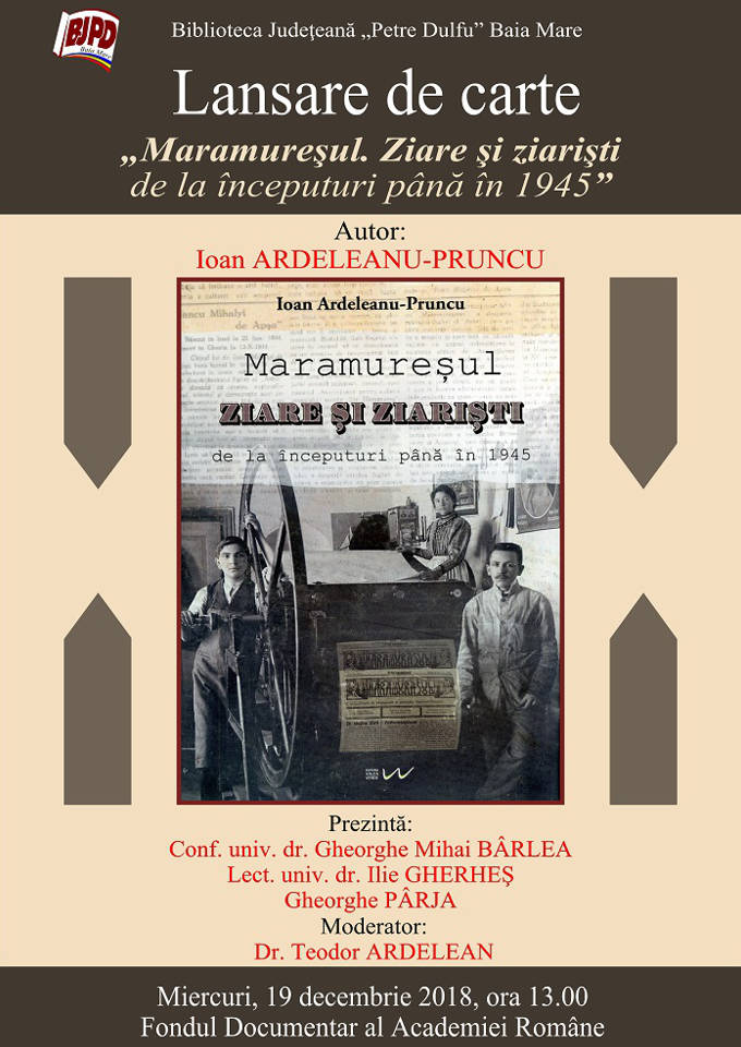 Biblioteca Judeţeană „Petre Dulfu” organizează lansarea cărţii „Maramureşul. Ziare şi ziarişti: De la începuturi la 1945”, autor Ioan ARDELEANU-PRUNCU, apărut la Editura Valea Verde, Sighetu Marmaţiei, 2018.