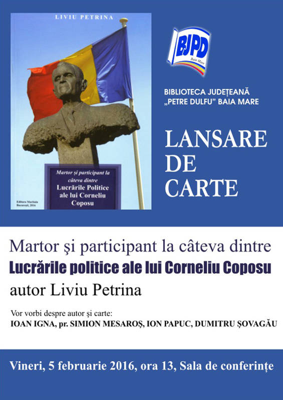Va avea loc lansarea cărţii „Martor şi participant la câteva dintre lucrările politice ale lui Corneliu Coposu„, de Liviu Petrina.