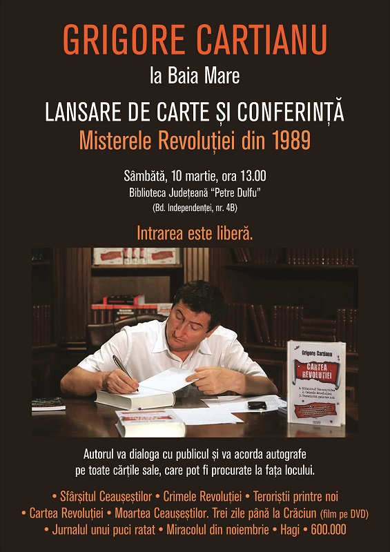Biblioteca Județeană “Petre Dulfu” Baia Mare va găzdui sâmbătă, 10 martie 2018, de la ora 13, conferinţa cu tema: „Misterele Revoluției din 1989”, susținută de ziaristul Grigore Cartianu.