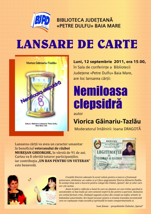 Are loc lansarea cărţii Nemiloasa clepsidră autor Viorica GĂINARIU-TAZLĂU. Moderatorul întâlnirii: Ioana DRAGOTĂ.