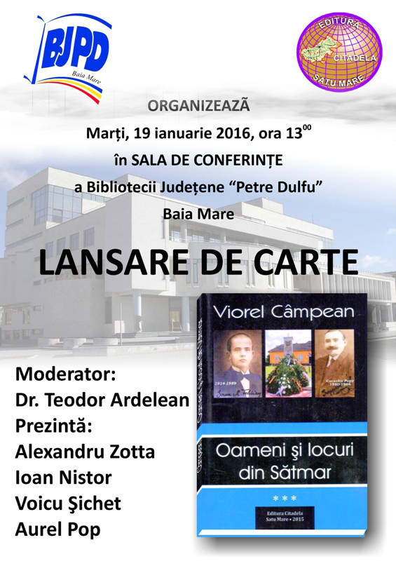 Cartea va fi prezentată de: Alexandru Zotta, Ioan Nistor, Voicu Şichet, Aurel Pop.