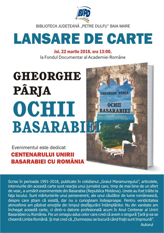 Va avea loc lansarea cărţii „Ochii Basarabiei”, semnată de scriitorul şi jurnalistul Gheorghe Pârja, apărută la Biblioteca Judeţeană „Petre Dulfu”, Baia Mare, 2018. Evenimentul este dedicat Centenarului Unirii Basarabiei cu România.