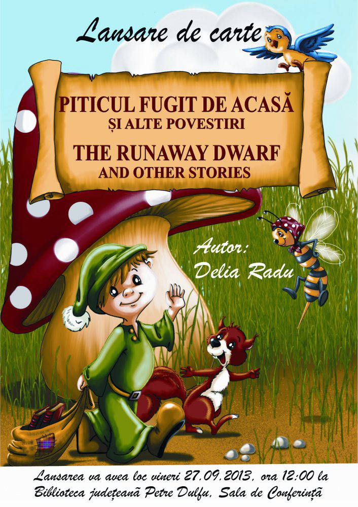 Cu ocazia Sărbătorii Castanelor ediţia XXI, va avea loc lansarea volumului pentru copii „Piticul fugit de acasă şi alte povestiri” în ediţie bilingvă româna- engleză, autor Delia Radu. Lansarea va avea loc la Biblioteca Judeţeană Petre Dulfu Baia Mare, Sala de Conferinte, ora 12.00.
