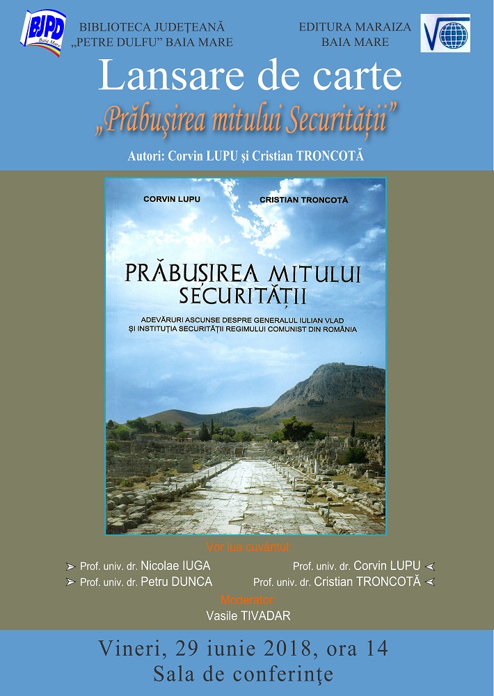 Vineri, 29 iunie, ora 14, la Sala de conferinţe va avea loc lansarea volumului „Prăbuşirea mitului Securităţii”, autori: Corvin Lupu şi Cristian Troncotă, lucrare apărută la Editura Elion, Bucureşti, 2018.