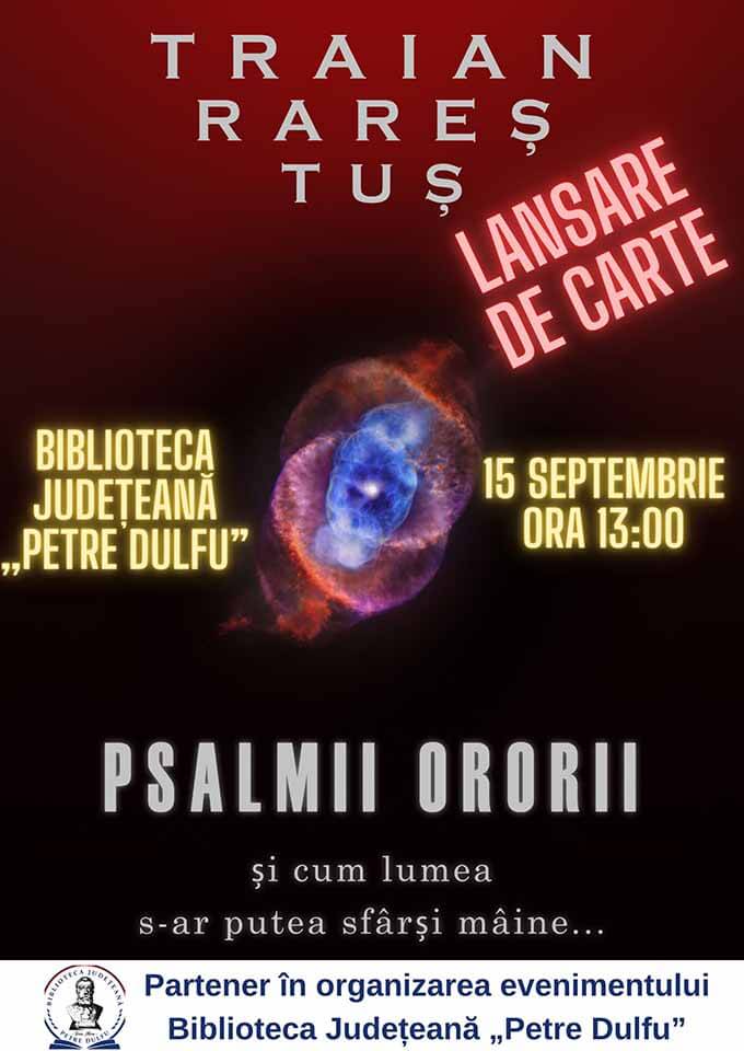 Biblioteca Județeană „Petre Dulfu” Baia Mare organizează lansarea volumului „Psalmii ororii și cum lumea s-ar putea sfârși mâine…”, autor Traian Rareș Tuș, apărut la Editura Galaxia Gutenberg, Târgu Lăpuș, 2023.