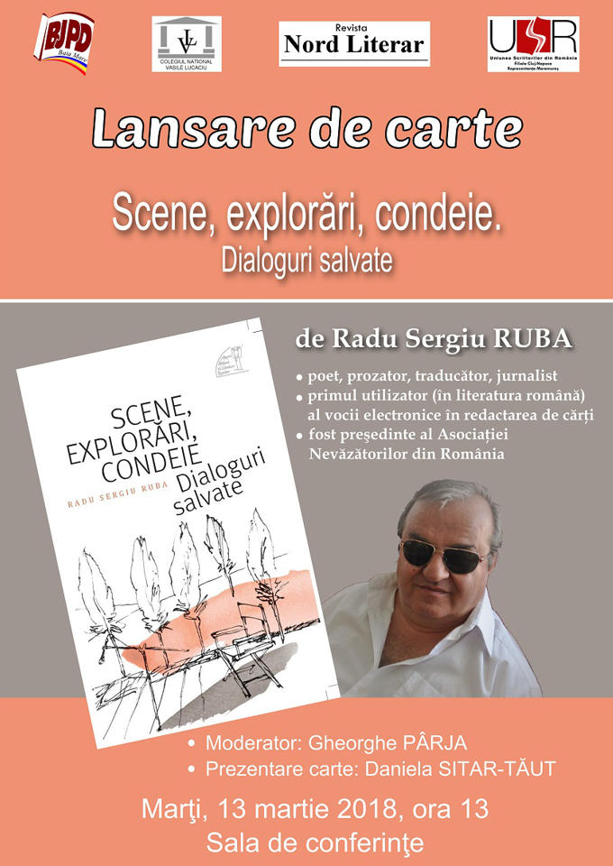 Biblioteca Judeţeană „Petre Dulfu” organizează lansarea cărţii „Scene, explorări, condeie: dialoguri salvate”, de Sergiu Radu Ruba, apărută la Editura Muzeul Literaturii Române, Bucureşti, 2018.