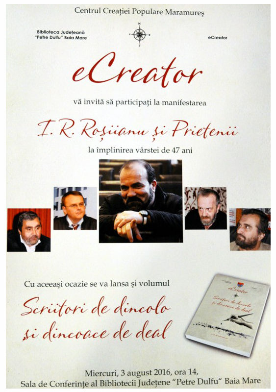 eCreator în colaborare cu Centrul Judeţean pentru Conservarea şi Promovarea Culturii Tradiţionale Maramureş şi Biblioteca Judeţeană „Petre Dulfu” vă invită la manifestarea „Ioan Romeo Roşiianu şi prietenii”, la împlinirea vârstei de 47 de ani.