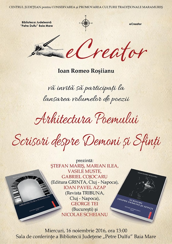 Centrul Judeţean pentru Conservarea şi Promovarea Culturii Tradiţionale Maramureş în colaborare cu Biblioteca Judeţeană „Petre Dulfu” organizează lansarea volumelor de poezii „Arhitectura poemului” (2015) şi „Scrisori despre demoni şi sfinţi” (2016), volume de poezii de Ioan Romeo Roşiianu, apărute la Editura Ethnologica, Baia Mare.