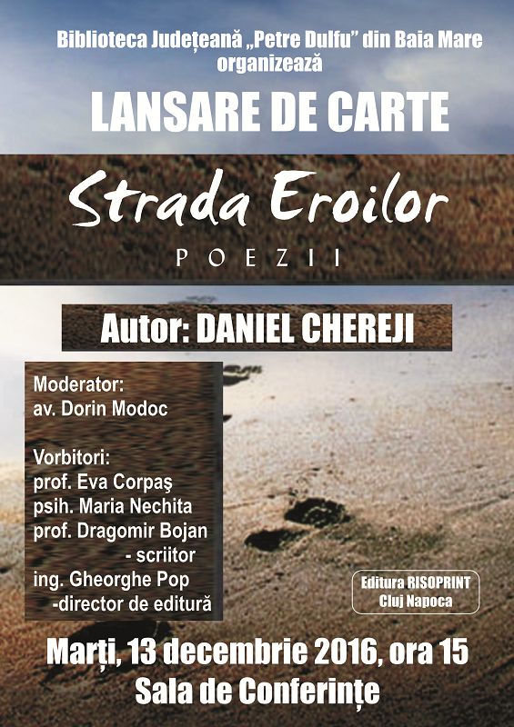 Va avea loc lansarea volumului de poezii „Strada Eroilor„, de Daniel Chereji, apărut la Editura Risoprint, Cluj-Napoca, 2016.
