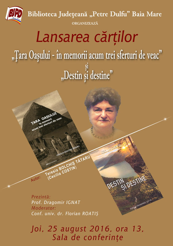Joi, 25 august 2016, ora 13, în Sala de Conferințe a Bibliotecii Județene „Petre Dulfu” din Baia Mare va avea loc lansarea volumelor: