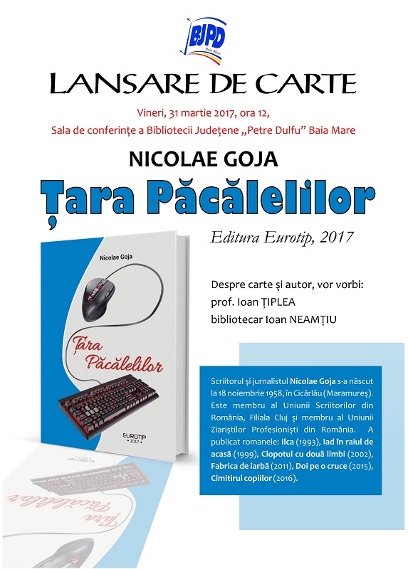 Va avea loc lansarea cărţii „Ţara păcălelilor”, apărută la Editura Eurotip, Baia Mare, 2017, sub semnătura scriitorului şi jurnalistului Nicolae Goja.