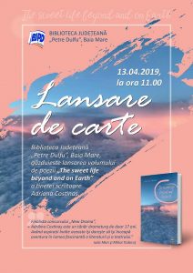 Biblioteca Judeţeană „Petre Dulfu” organizează lansarea volumului de poezii intitulat „The sweet life beyond and on Earth”, semnat de tânăra Adriana Costinaş, apărut la editura Rotipo, Iaşi, 2019.