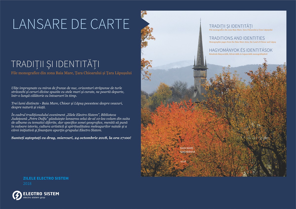Miercuri, 24 octombrie, ora 17.00, la Sala de conferinţe va avea loc lansarea albumului „Tradiţii şi identităţi: File monografice din zona Baia Mare, Ţara Chioarului şi Ţara Lăpuşului”, în cadrul tradiţionalului eveniment „Zilele Electro Sistem”, al zecelea volum din suita de albume cu tematici diferite, dar specifice zonei geografice, menită să pună în valoare: istoria, cultura artistică şi spiritualitatea acestor meleaguri şi a cărei iniţiativă şi finanţare aparţin grupului Electro Sistem (Ştefan Blasko, director general).