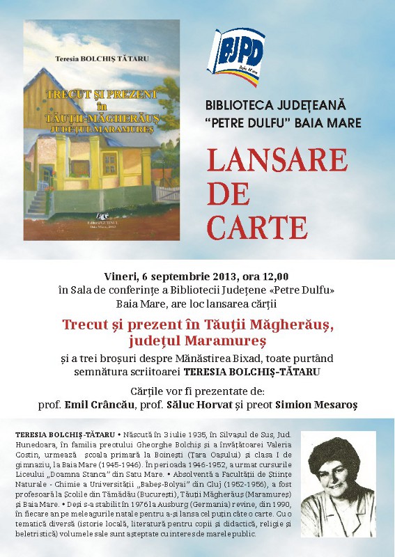 Biblioteca Județeană „Petre Dulfu” în colaborare cu editura Gutinul organizează lansarea cărții „Trecut și prezent în Tăuții-Măgherăuș, județul Maramureș” și a trei broșuri despre Mănăstirea Bixad, toate purtând semnătura scriitoarei Teresia Bolchiș-Tătaru.