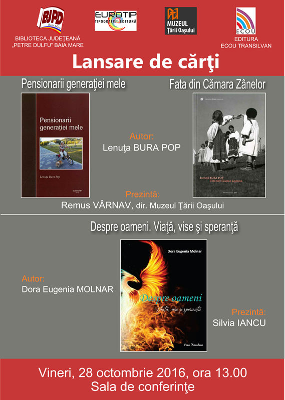 Biblioteca Judeţeană „Petre Dulfu” în colaborare cu editurile Eurotip (Baia Mare), Muzeul Ţării Oaşului (Negreşti-Oaş), Ecou Transilvan (Cluj-Napoca) organizează o triplă lansare de carte.
