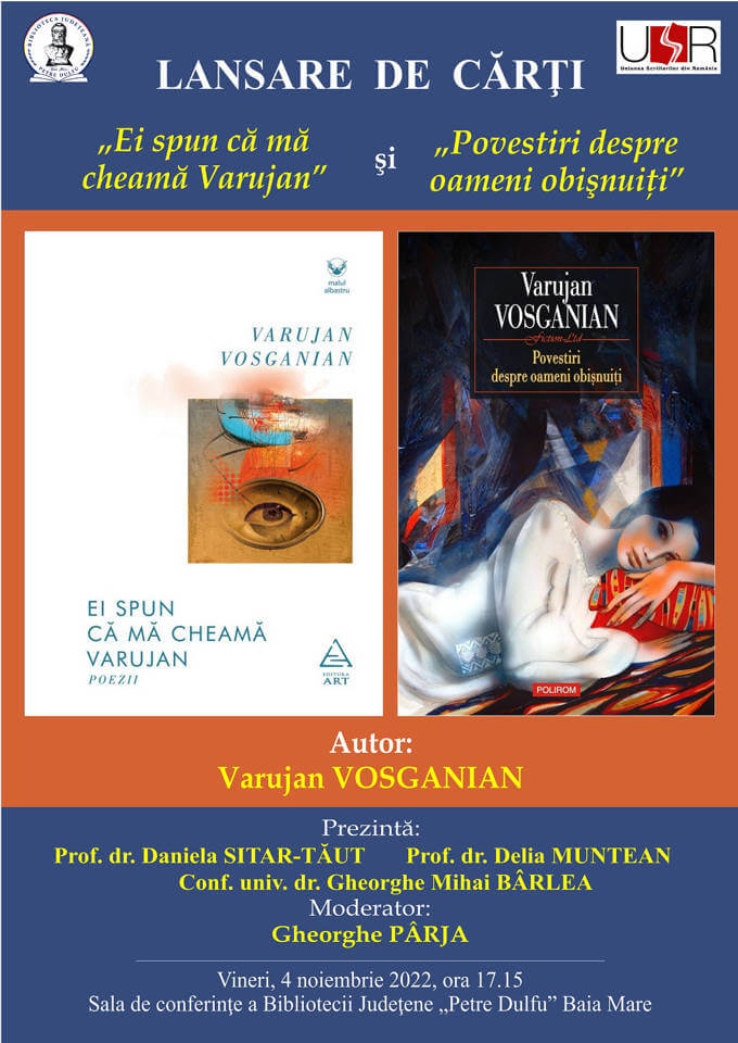 Biblioteca Județeană „Petre Dulfu” în colaborare cu Uniunea Scriitorilor din România – reprezentanța Baia Mare organizează lansarea a două cărți purtând semnătura lui Varujan Vosganian. Primul, un volum de proză se intitulează „Povestiri despre oameni obișnuiți”, a apărut la editura Polirom, Iași, 2022, iar al doilea, un volum de poezii cu titlul „Ei spun că mă cheamă Varujan”, apărut la Editura ART, București, 2019.