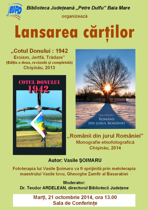 Marţi, 21 octombrie la ora 13, în Sala de Conferințe, Biblioteca Judeţeană „Petre Dulfu” vă învită la întâlnirea cu cunoscutul scriitor basarabean VASILE ŞOIMARU. Acesta îşi va lansa la Baia Mare două cărţi: o nouă ediție a albumului Românii din jurul României și Cotul Donului : 1942.