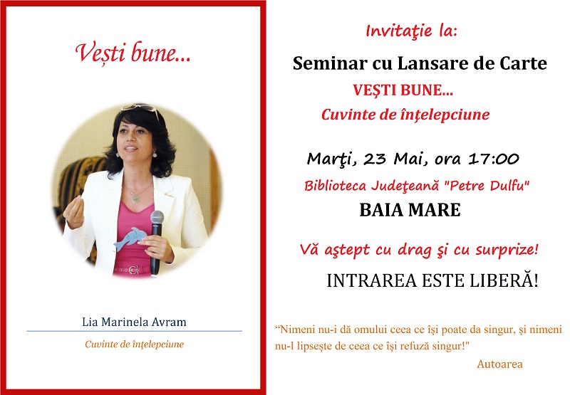 Va avea loc lansarea cărţii „Veşti bune – cuvinte de înţelepciune„, un nou volum pentru iubitorii de carte inspiraţională şi poveşti despre viaţă, semnat Lia Marinela Avram.