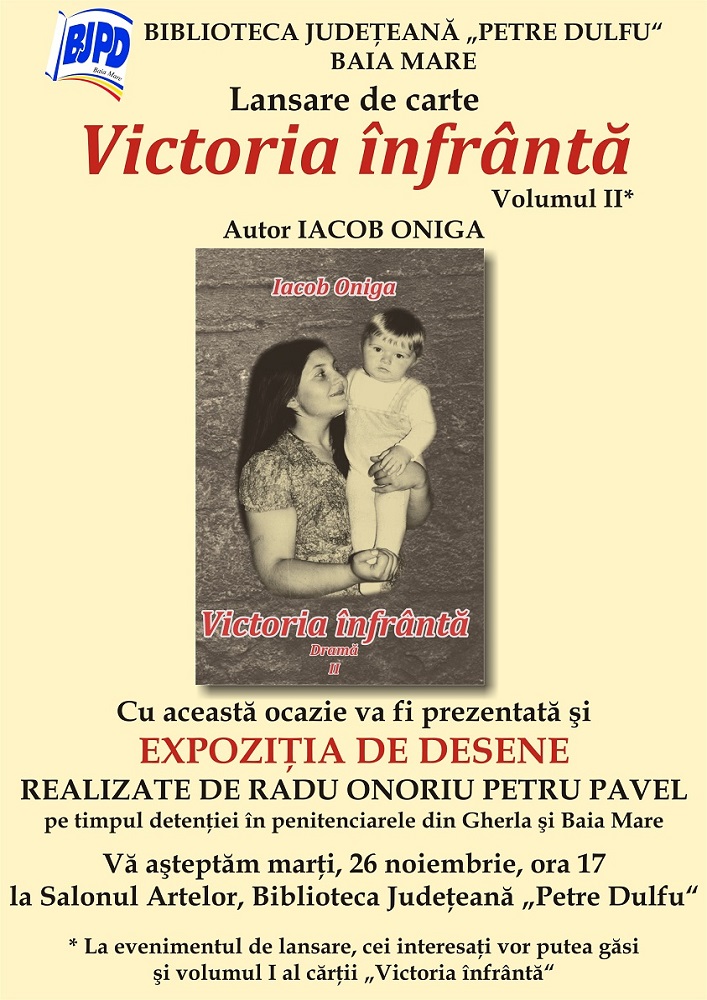 Biblioteca Județeană “Petre Dulfu” organizează lansarea volumului al doilea* al cărții “Victoria înfrântă”, semnat de Iacob Oniga, apărut la Editura Eurotip, Baia Mare, 2019.