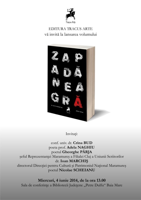 Va avea loc lansarea volumului de proză scurtă Zăpadă neagră și alte povestiri, Editura Tracus Arte, București, 2014. Autoare: jurnalista Anca GOJA.