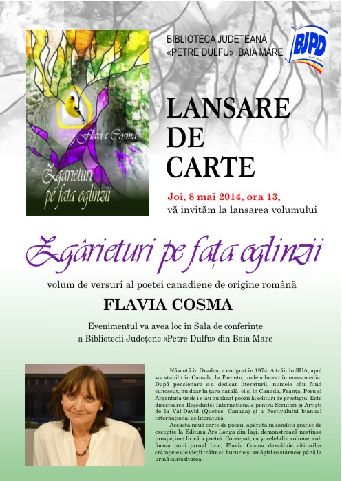 Vă invită la lansarea volumului Zgârieturi pe fata oglinzii, volum de versuri al poetei canadiene de origine română FLAVIA COSMA.
