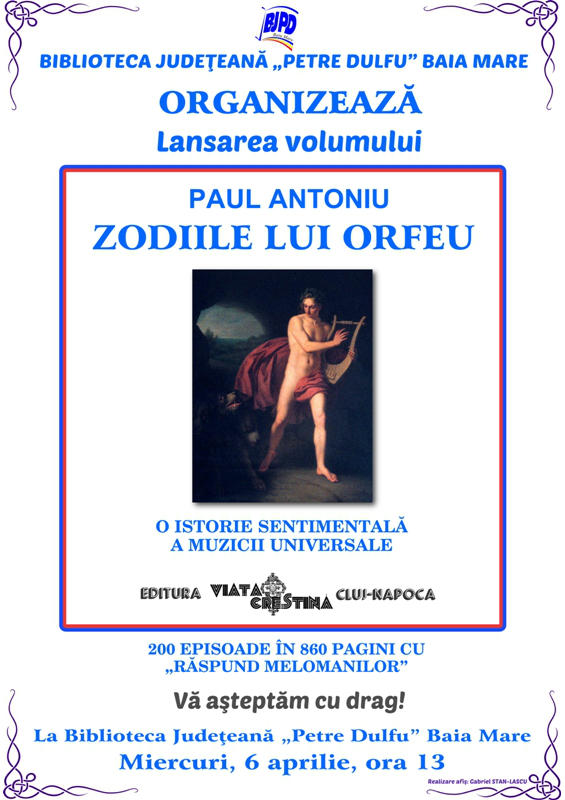 Va avea loc lansarea cărţii „Zodiile lui Orfeu – O istorie sentimentală a muzicii universale„, de Paul Antoniu.