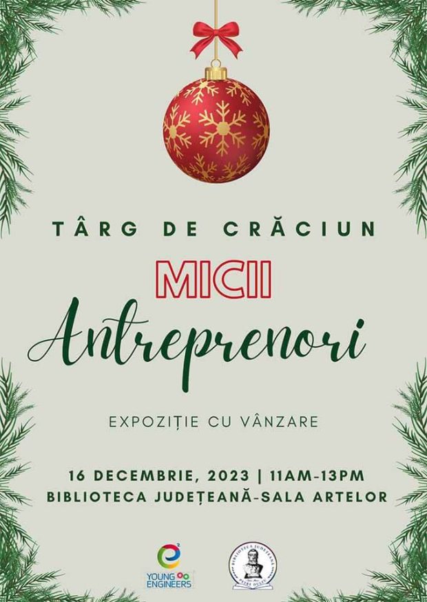 Sâmbătă, 16 decembrie 2023, ora 11.00 – Salonul Artelor: Asociația „Young engineers” organizează atelierul de Crăciun intitulat „Micii antreprenori” pentru copiii membrilor asociației. Produsele rezultate vor fi expuse și vor putea fi achiziționate de către părinți. Persoană de contact: Radu Vălean.