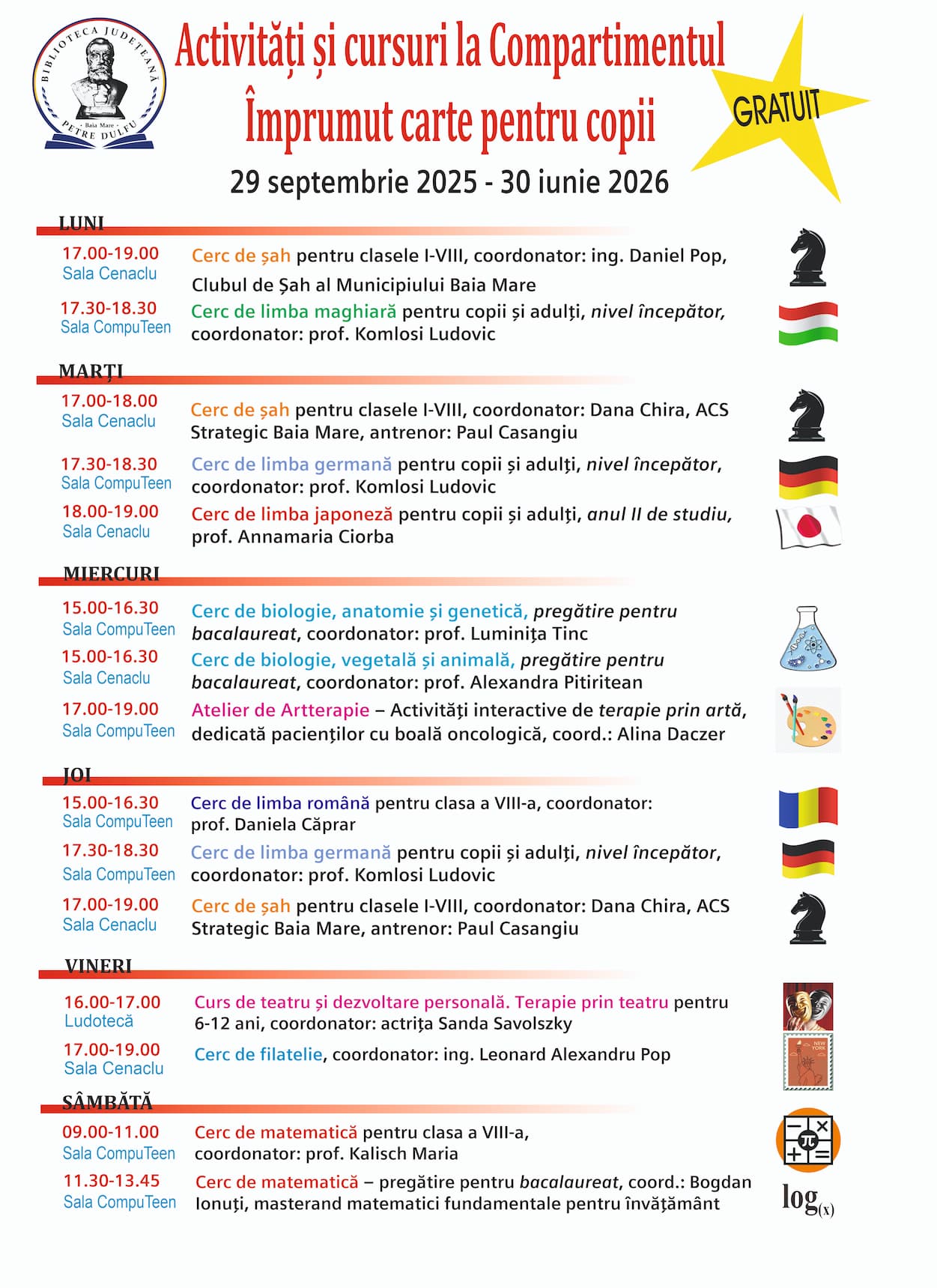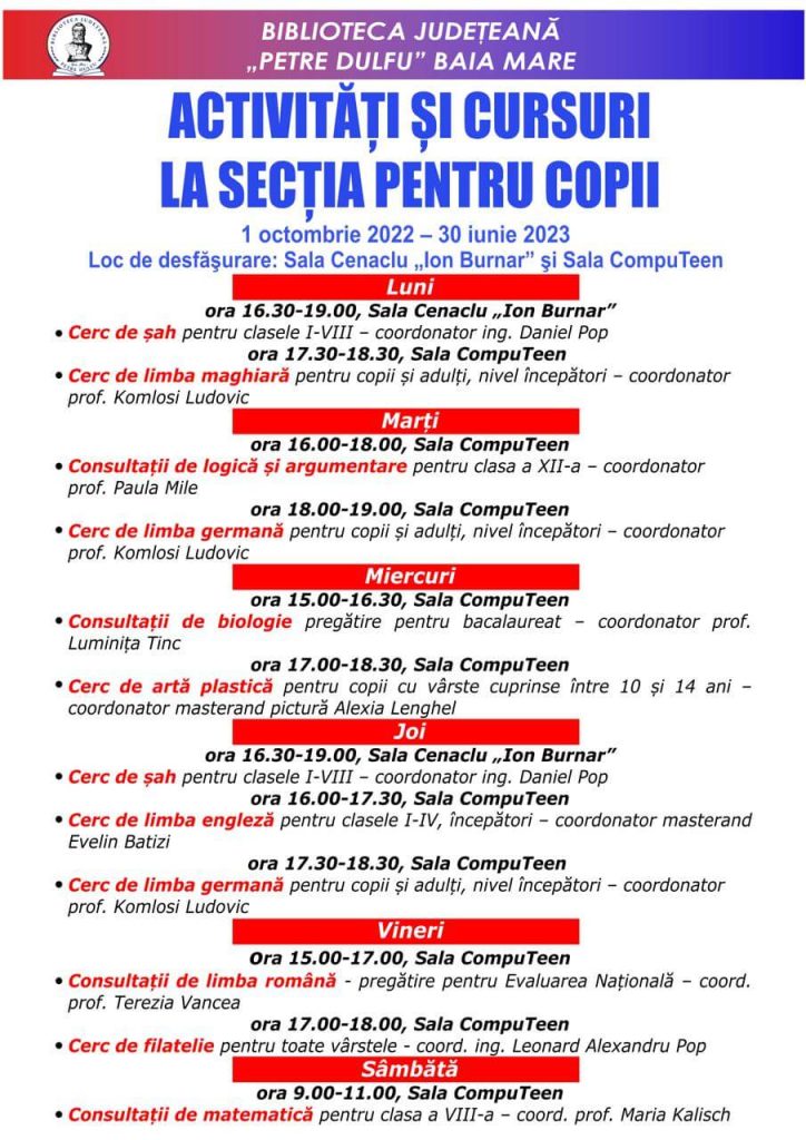 Biblioteca Judeţeană „Petre Dulfu” Baia Mare organizează activități și cursuri la Compartimentul Împrumut carte pentru copii.