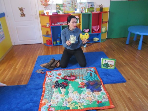 Primele poveşti prezentate au fost două poveşti româneşti, la care doamna Annick Harbulot, fostă educatoare şi formator al educatoarelor, actualmente pensionară şi membră a Asociaţiei «Gradinitsa» din Bar-le-Duc, Franţa, a realizat două covoare povestitoare: „Capra cu trei iezi” şi „Povestea sticletelui”. Asociația «Gradinitsa» ne-a donat primele covorașe („Capra cu trei iezi”, „Povestea sticletelui”, „Peștișorul roșu”, „Cele patru colțuri”, „Tatăl meu”, „Punguța cu doi bani”), iar doamnele Annick Harbulot și Lidya Block au făcut prezentări demonstrative, pentru a învăța această tehnică pe toți cei interesați.