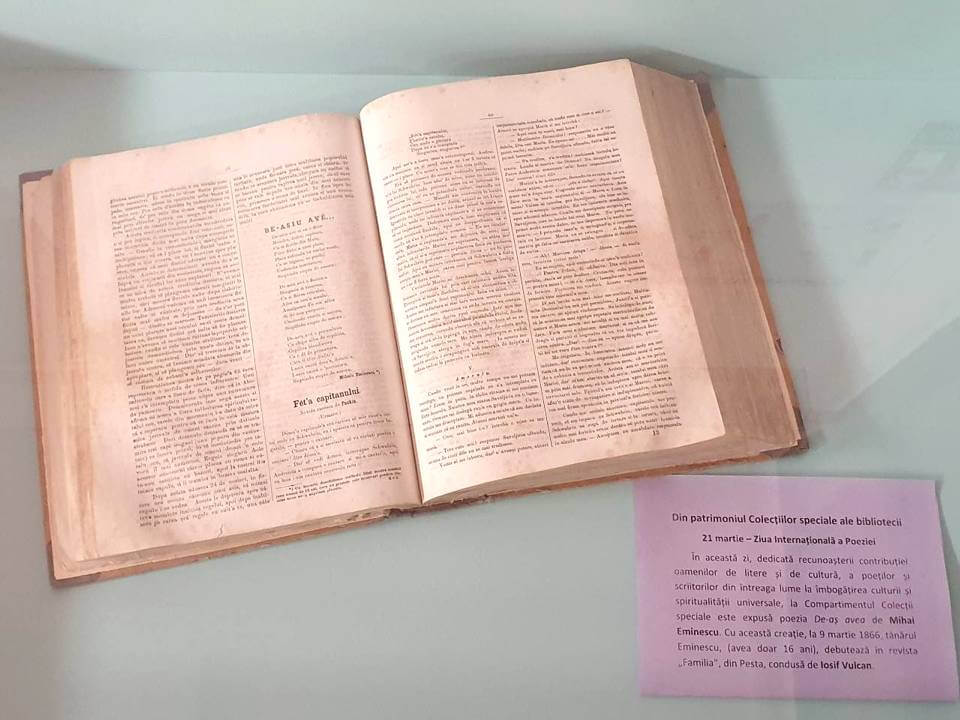 21 martie – Ziua Internațională a Poeziei. În această zi, dedicată recunoașterii contribuției oamenilor de litere și de cultură, a poeților și scriitorilor din întreaga lume la îmbogățirea culturii și spiritualității universale, la Compartimentul Colecții speciale este expusă poezia De-aș avea de Mihai Eminescu. Cu această creație, la 9 martie 1866, tânărul Eminescu, (avea doar 16 ani), debuta în revista „Familia”, din Pesta, condusă de Iosif Vulcan.