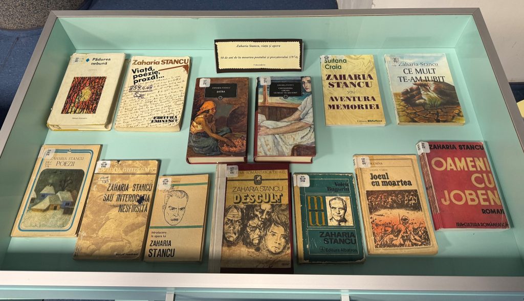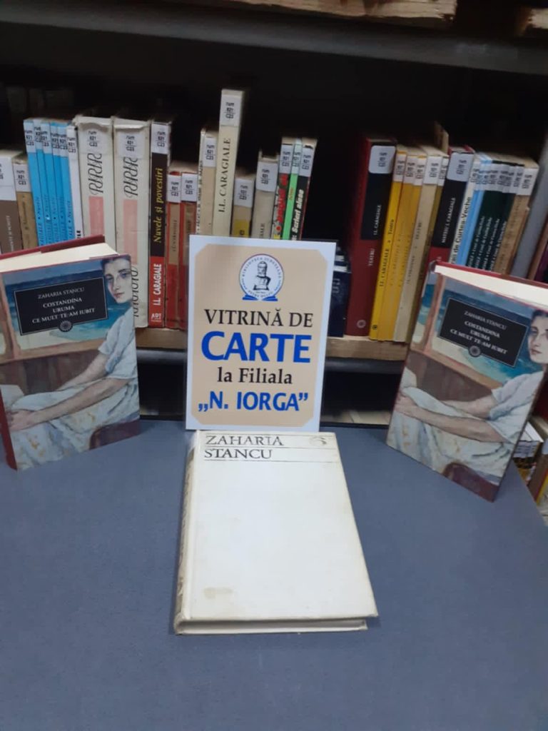 vitrină de carte realizată la Filiala „Nicolae Iorga’’, pentru a marca împlinirea a 50 de ani de la moartea scriitorului, poetului, romancierului şi prozatorului