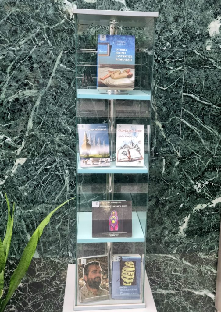 Vitrina de carte a Compartimentului Împrumut carte pentru adulți – „Autori maramureșeni” reunește o selecție de opere ale unor scriitori contemporani, activi în viața literară maramureşeană: