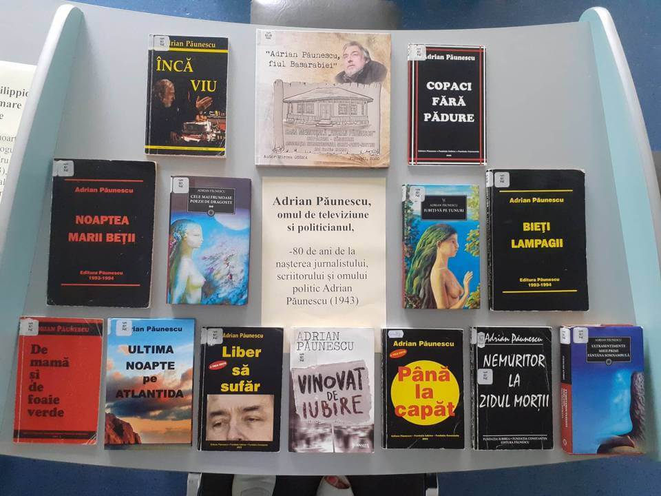 Adrian Păunescu, omul de televiziune și politicianul – 80 de ani de la nașterea jurnalistului, scriitorului și omului politic Adrian Păunescu (1943), vitrină de carte realizată de Compartimentul Împrumut carte pentru adulți.