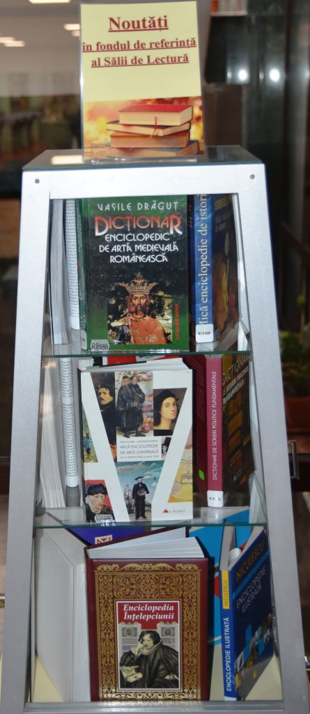 Noutăți în fondul de referință al Sălii de lectură – vitrină de carte realizată la Sala de lectură Carte curentă: