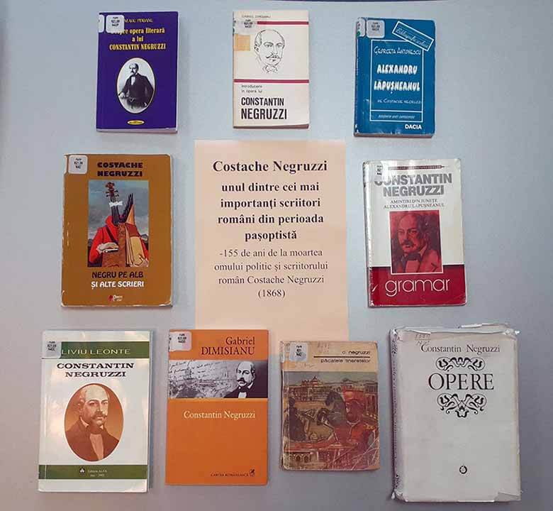 Costache Negruzzi, unul dintre cei mai importanți scriitori români din perioada pașoptistă – 155 de ani de la moartea omului politic şi scriitorului român Costache Negruzzi (1868), vitrină de carte realizată de Compartimentul Împrumut carte pentru adulți