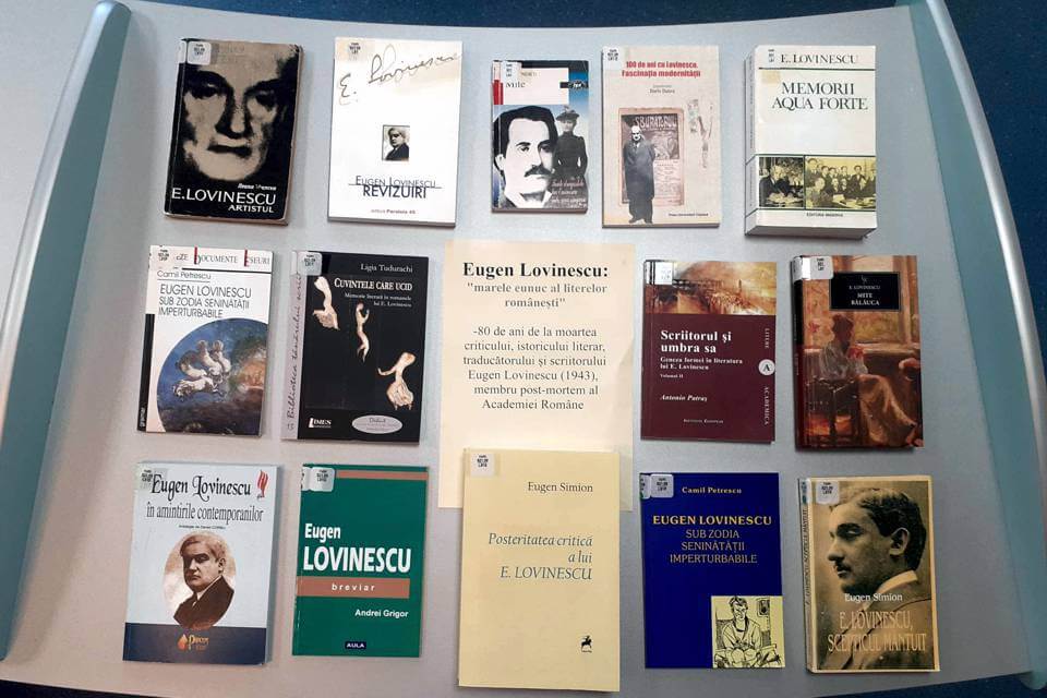 Eugen Lovinescu „marele eunuc al literelor românești”, 80 de ani de la moartea criticului, istoricului literar, traducătorului și scriitorului Eugen Lovinescu (1943), membru post-mortem al Academiei Române, vitrină de carte realizată de Compartimentul Împrumut carte pentru adulți.