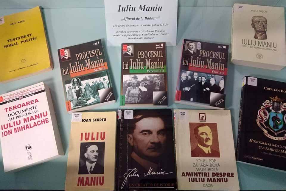 Iuliu Maniu, „Sfinxul de la Bădăcin”. 150 de ani de la nașterea omului politic (1873), membru de onoare al Academiei Române, ministru și președinte al Consiliului de Miniștri în mai multe mandate ‒ vitrină de carte realizată la Compartimentul Împrumut carte pentru adulți.