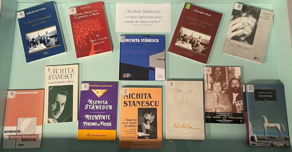 Vitrină de carte realizată la Compartimentul Împrumut carte pentru adulți pentru a marca 90 de ani de la naşterea poetului, scriitorului şi eseistului român Nichita Stănescu: