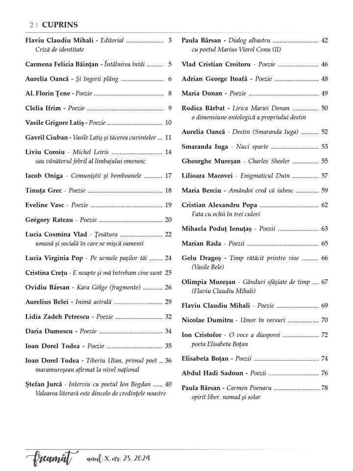 Gavril Ciuban ne amintește despre „Vasile Latiș și tăcerea cuvintelor”, iar Liviu Coroiu despre Michei Leiris, „vânătorul febril al limbajului omenesc”, în timp ce Ioan Dorel Todea îl aduce în prim-plan pe „Tiberiu Utan, primul poet maramureșean afirmat la nivel național”. Doamna Rodica Bărbat redă „dimensiunea ontologică” a destinului din lirica Mariei Donan. Ion Cristofor prezintă „o voce a diasporei”, poeta Elisabeta Boțan.