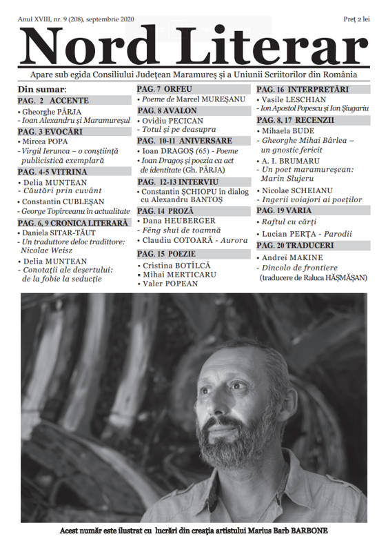 În numărul pe septembrie al „Nordului Literar”, Mircea Popa evocă personalitatea lui Virgil Ierunca, „o conștiință publicistică exemplară”, la o sută de ani de la naștere. Gheorghe Pârja amintește că s-au scurs douăzeci de ani de la trecerea în neființă a poetului Ioan Alexandru, evidențiind legăturile acestuia cu Maramureșul. La rubrica „Vitrina”, Delia Muntean prezintă cititorilor antologia de poezie și proză coordonată de Gelu Dragoș, Vasile Bele și Nelu Danci, Oprește-mă la tine, Maramureș! Oprește-mă în tine, anotimp! Constantin Cubleșan îl readuce în actualitate pe George Topîrceanu. Daniela Sitar-Tăut prezintă „un traduttore deloc tradittore: Nicolae Weisz”, analizând unul dintre volumele traduse de acesta, Ghidul tatălui de adolescenți. În cronica literară asupra cărții lui Constantin Tonu, Deșertul în literatură, Delia Muntean relevă „conotații ale deșertului: de la fobie la seducție”. Despre romanul lui Gh. Scwhartz, Cei o sută, „un soi de comedie umană”, scrie Ovidiu Pecican. Interpretări critice asupra volumului Sigilii de sare face Mihaela Bude în recenzia Gheorghe Mihai Bârlea – un gnostic fericit.