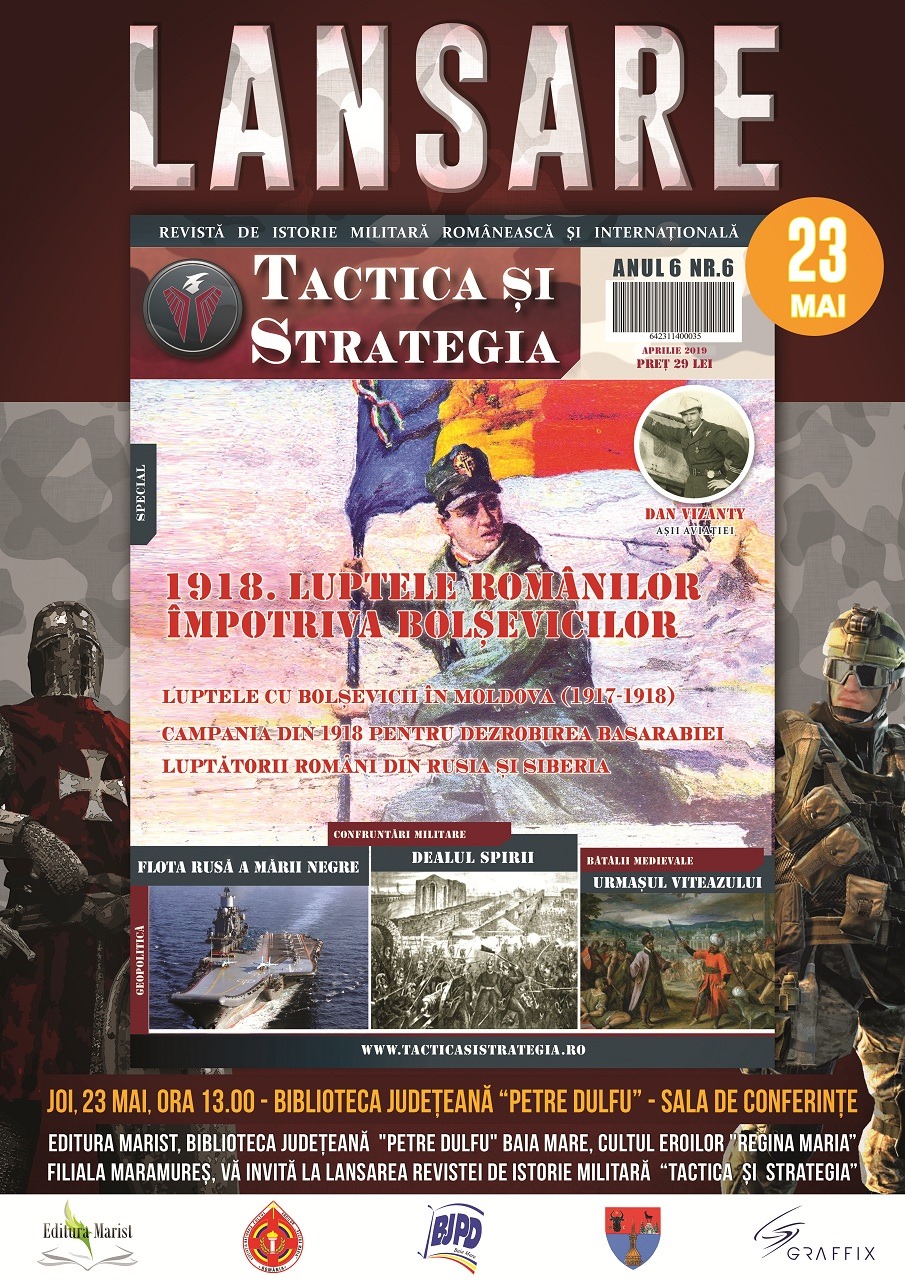 Biblioteca Judeţeană „Petre Dulfu” în colaborare cu Asociaţia Naţională Cultul Eroilor „Regina Maria” – Filiala Maramureş şi Editura Marist organizează lansarea numărului 6, aprilie 2019 al revistei de istorie militară românească şi internaţională „Tactica şi Strategia”, editată cu sprijinul Consiliului Judeţean Maramureş şi al Bibliotecii Judeţene „Petre Dulfu”.