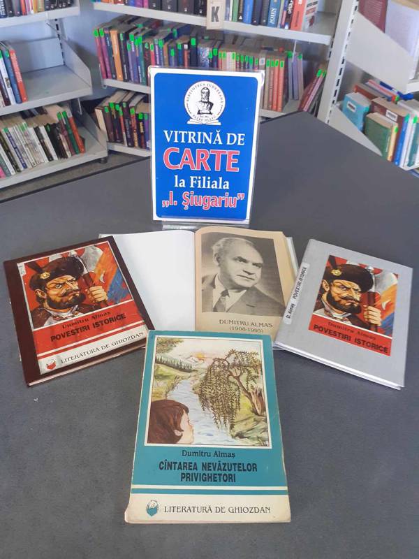 Vitrină de carte realizată la Filiala „Ion Şiugariu” cu ocazia aniversării a 115 ani de la naşterea scriitorului şi istoricului Dumitru Almaş.