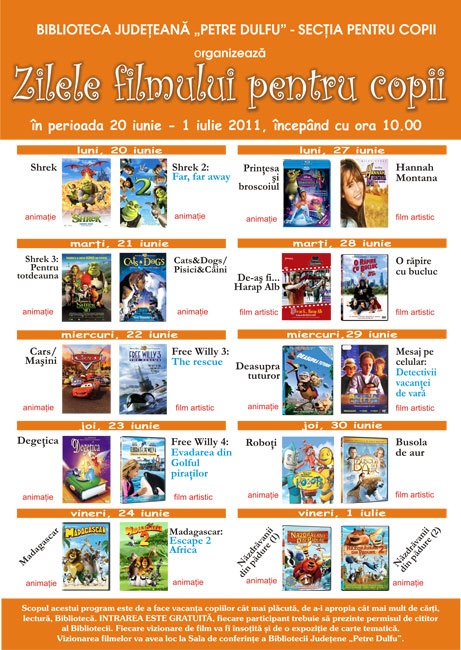 Biblioteca Judeţeană „Petre Dulfu”, Secţia pentru copii, organizează în perioada 20 iunie – 1 iulie, 2011, începând cu orele 10.00 programul cultural ”Zilele filmului pentru copii”. Intrarea este gratuită, fiecare participant trebuie să prezinte permisul de cititor al Bibliotecii. Fiecare vizionare va fi însoţită şi de o expoziţie de carte tematică.
