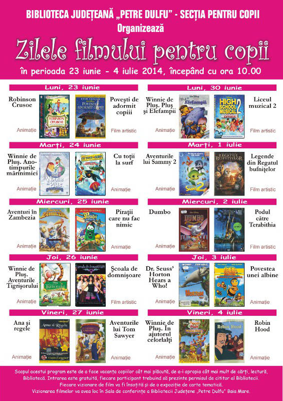 Biblioteca Judeţeană „Petre Dulfu”, Secţia pentru copii, organizează în perioada 23 iunie-04 iulie, 2014, începând cu orele 10:00 programul cultural: „Zilele filmului pentru copii„.