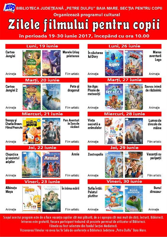 Biblioteca Judeţeană „Petre Dulfu”, Secţia pentru copii, organizează în perioada 19 iunie-30 iunie, 2017, începând cu orele 10.00 programul cultural „Zilele filmului pentru copii”.